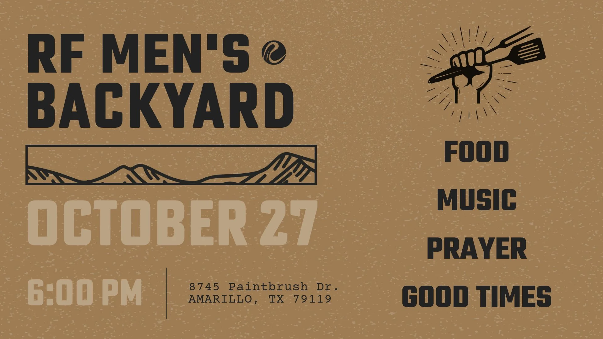 RF Men's Backyard Sunday, October 27, 2024 6:00 PM 8:00 PM 18:00 20:00 Men's Backyard 8745 Paintbrush Drive Amarillo, TX, 79119 United States (map) Google Calendar ICS SAVE THE DATE!RF Men’s Backyard – Sunday October 27! 8745 Paintbrush Dr. | 6:00 PM